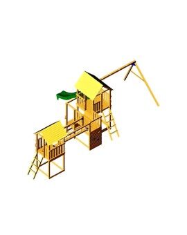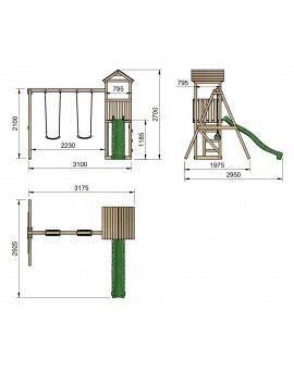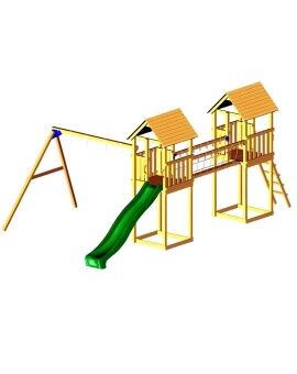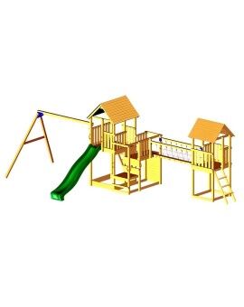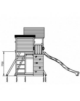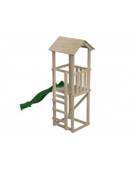 Fun Tower: This playground features a square wooden tower with a platform at a height of 90 cm, from which your children can slide down a 120 cm long slide. Access to the tower is via two steps on the side opposite the slide, each 30 cm. The first step is a platform, and the second is a vertical step. The tower has a fun design with a double-pointed roof.